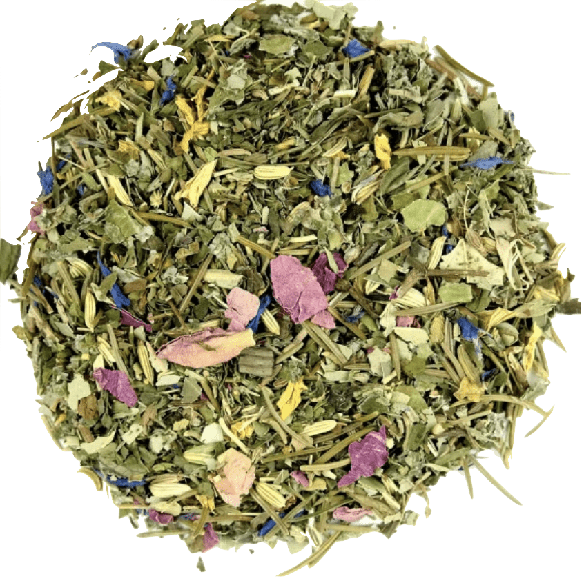 Venkel, eucalyptusbladeren, pepermunt, sparrenscheuten, anijs, bramenbladeren, frambozenbladeren, groene munt, tijm, rozemarijn, weegbreebladeren, saliebladeren, goudsbloembloesem, rozenblaadjes, vlierbloesem, korenbloembloesem.